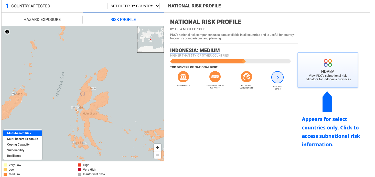 To access subnational risk information, select the NDPBA for a particilar country. Note: This button appears for countries in which data is available at the subnational level.